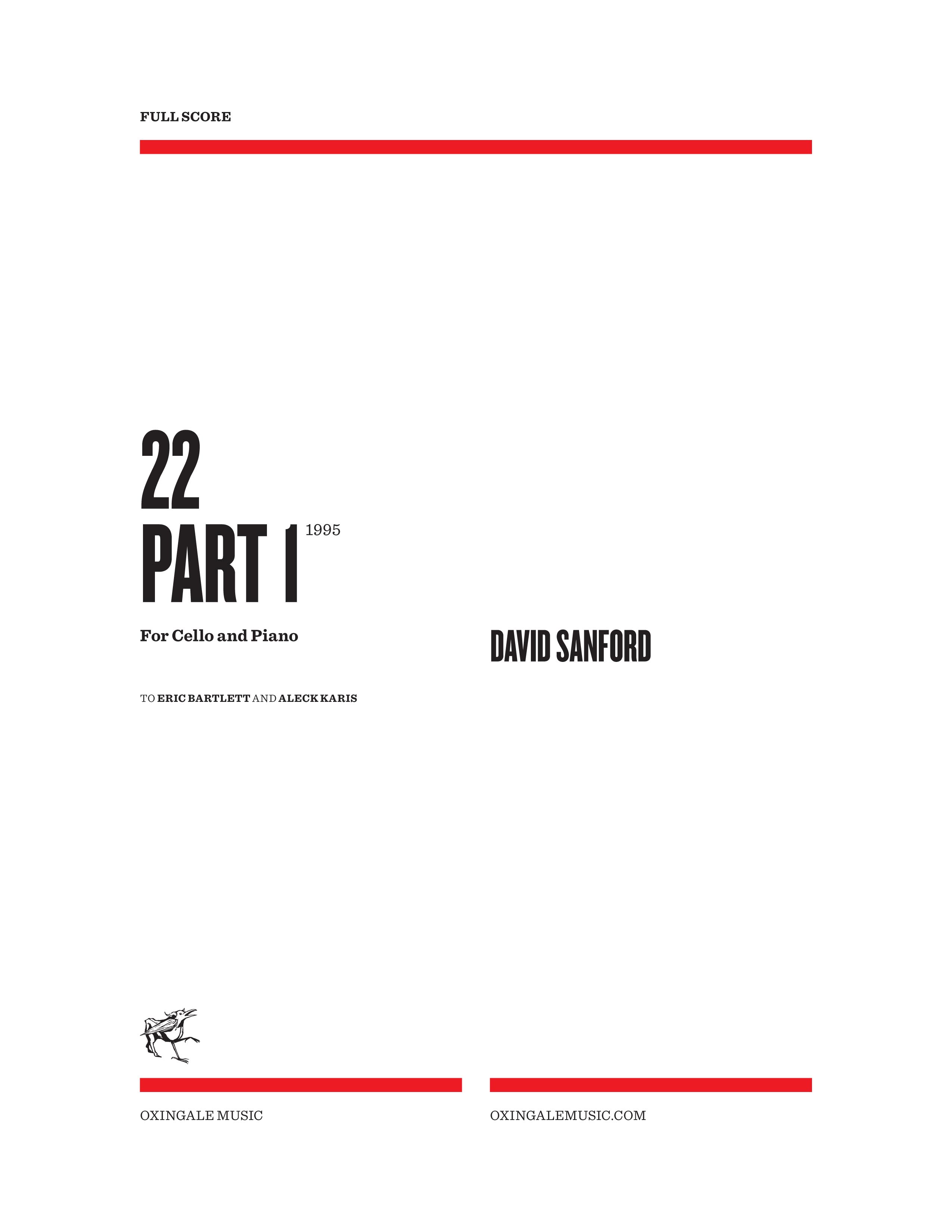 22 Part I was written for Eric Bartlett and Aleck Karis in 1995-96. Its completion was aided by a fellowship from the New Jersey State Council for the Arts/Department of State. Its two movements constitute the kernel and initial gesture of a spiralling three-part work utilizing progressively larger forces (in the vein of Berio’s Chemins). Although the piece employs an eleven-note set, the significance of the title has more to do with the semiotic capacity of numbers – an idea found in works such as Michael Mantler’s 13, George Crumb’s Black Angels, Peter Greenaway’s film Drowning by Numbers, and Ralph Pace’s drill for the 1976 27th Lancers drum and bugle corps.