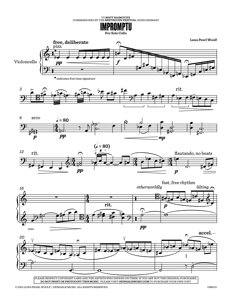 By Luna Pearl Woolf | For Solo Cello | 7′