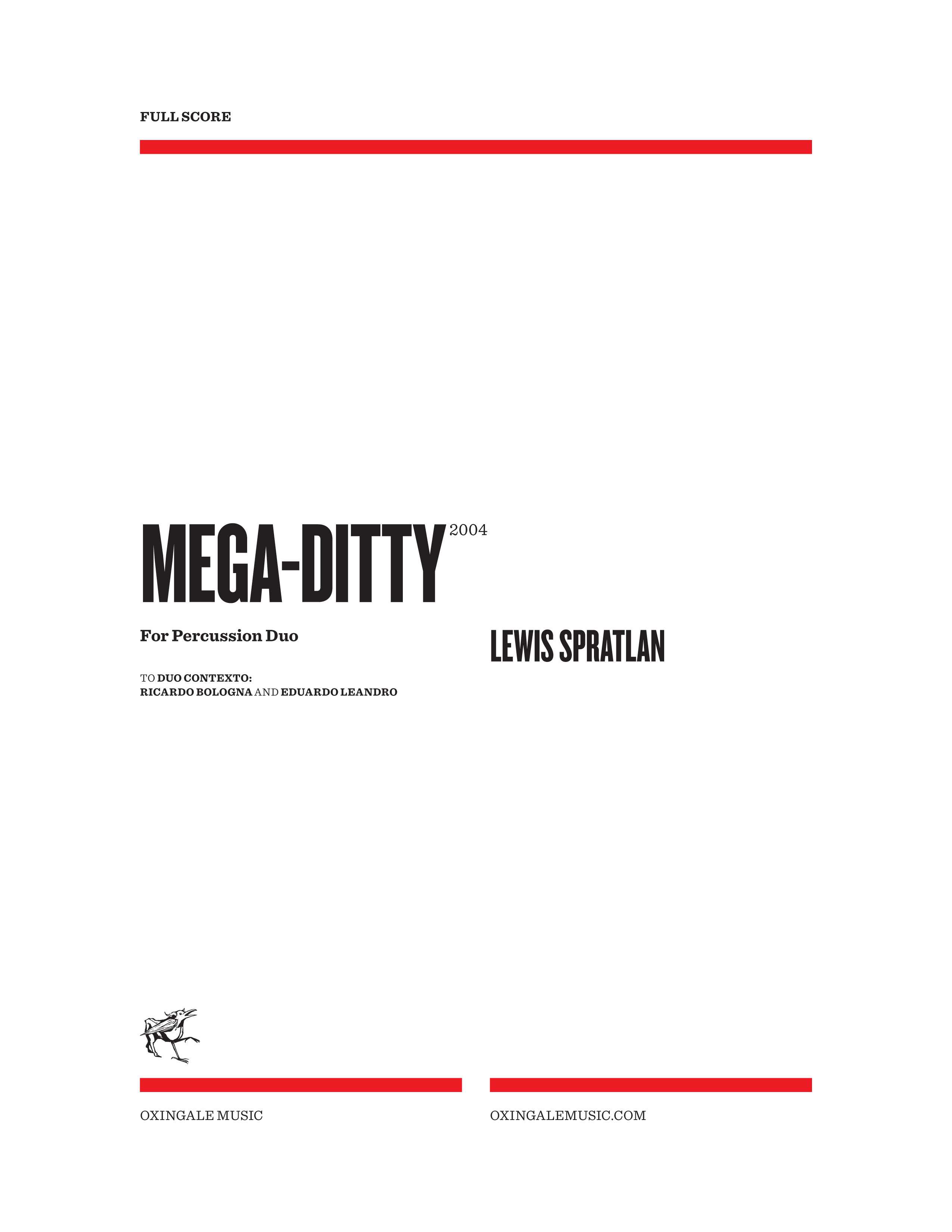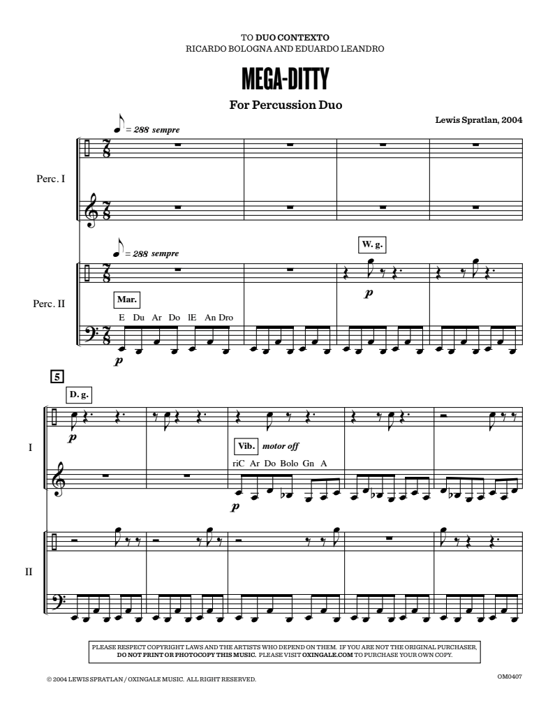 Mega-Ditty was composed for Duo Contexto (percussionists Eduardo Leandro and Ricardo Bologna) during the summer of 2004. The ditty in question is made up of two figures, each consisting of the musical letters in the duo’s names (E-D-A-D-E-A-D and C-A-D-Bb-G-A), thus a seven-note and a six-note figure, grinding against one another. When these notes are combined they make up a collection of six pitch-classes (G-A-Bb-C-D-E) which, later, is complemented by the collection B-C#-D#-E#-F#-G#. So, the piece’s polarities are the two figures of the ditty and the two six-note collections.