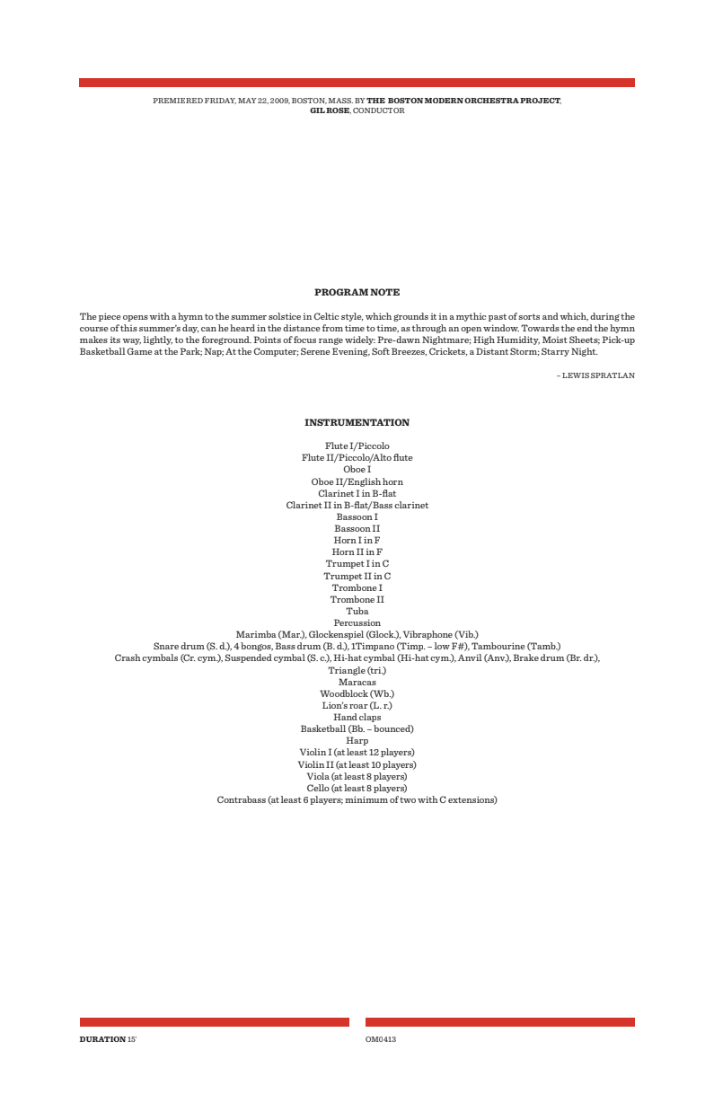 The piece opens with a hymn to the summer solstice in Celtic style, which grounds it in a mythic past of sorts and which, during the course of this summer’s day, can be heard in the distance from time to time, as through an open window. Towards the end the hymn makes its way, lightly, to the foreground. Points of focus range widely: Pre-dawn Nightmare; High Humidity, Moist Sheets; Pick-up Basketball Game at the Park; Nap; At the Computer; Serene Evening, Soft Breezes, Crickets, a Distant Storm; Starry Night.