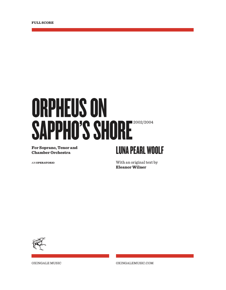 A large scale “Operatorio” in two acts, Orpheus on Sappho’s Shore is scored for soprano, tenor and chamber orchestra. Springing from a commission for soprano Jane Bryden, the concept was a collaboration between Woolf and poet Eleanor Wilner, whose original text was written for the project. The finished piece was premiered in 2004 by the Ensemble contemporain de Montréal, Véronique Lacroix conducting, and recorded on Oxingale’s Après Moi, le Déluge album.