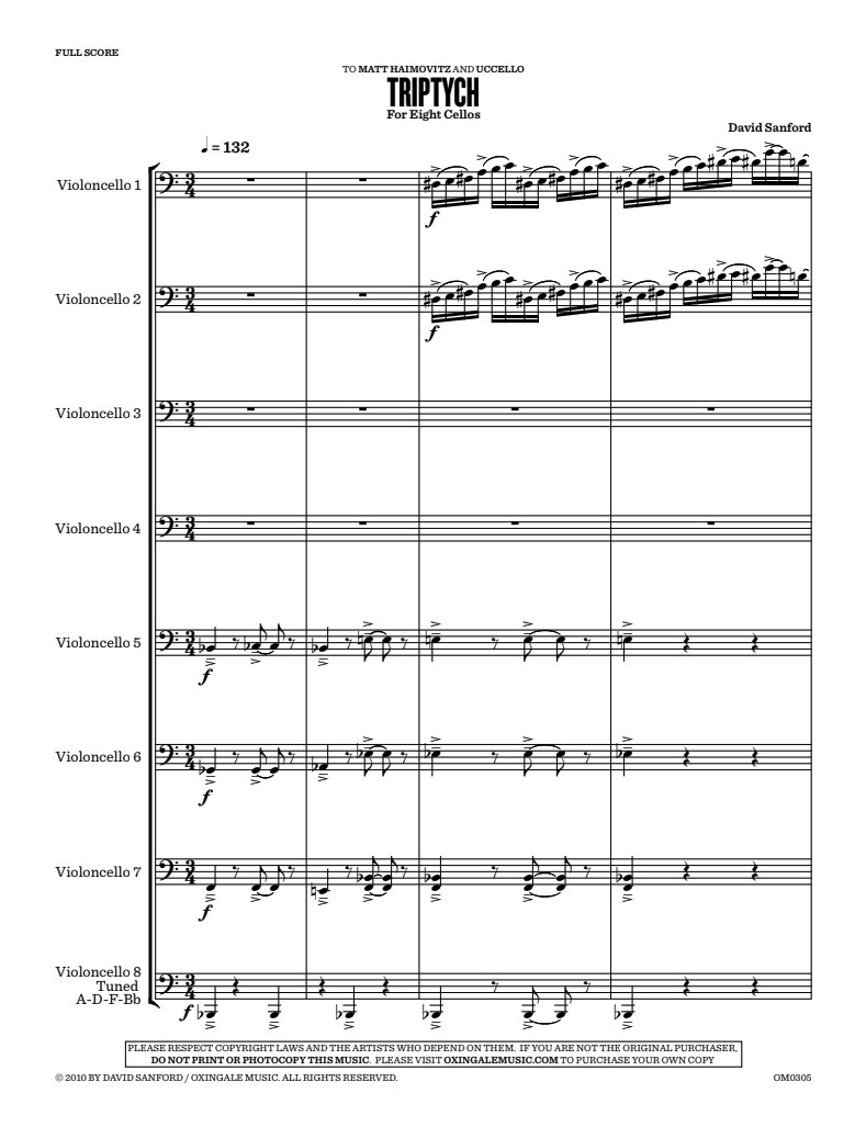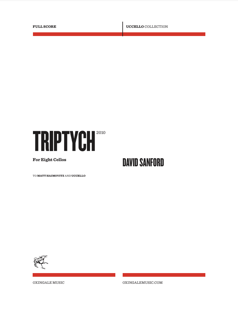 Triptych is an octet composed in 2010 for Matt Haimovitz and Uccello. The title refers in part to works by my friend, artist Chris Pouler, whose works occasionally feature likenesses of friends, relatives, musicians and composers in surreal, non-traditional, and/or symbolic settings. Two of Pouler’s musical interests, jazz pianists Vijay Iyer and Nik Bärtsch, are the more overt stylistic inspirations for this work.
