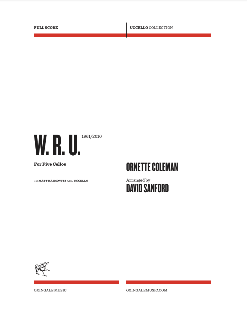 W.R.U. (1961) by Ornette Coleman is originally from the saxophonist (and Pulitzer Prize-winning composer)’s Ornette ! album featuring a quartet of alto, trumpet, bass and drums, which this version follows with three cellos. However this version is closer in intent and style to the more punk/thrash 1988 version by John Zorn on his Spy vs. Spy album featuring a quintet of two altos and drummers and a single bassist. The polyphonic solo section borrows and combines ideas used by Coleman, trumpeter Don Cherry, and altoists John Zorn and Tim Berne on both versions, along with several motifs of Coleman’s from other improvisations.