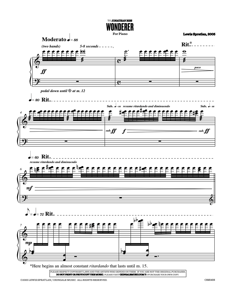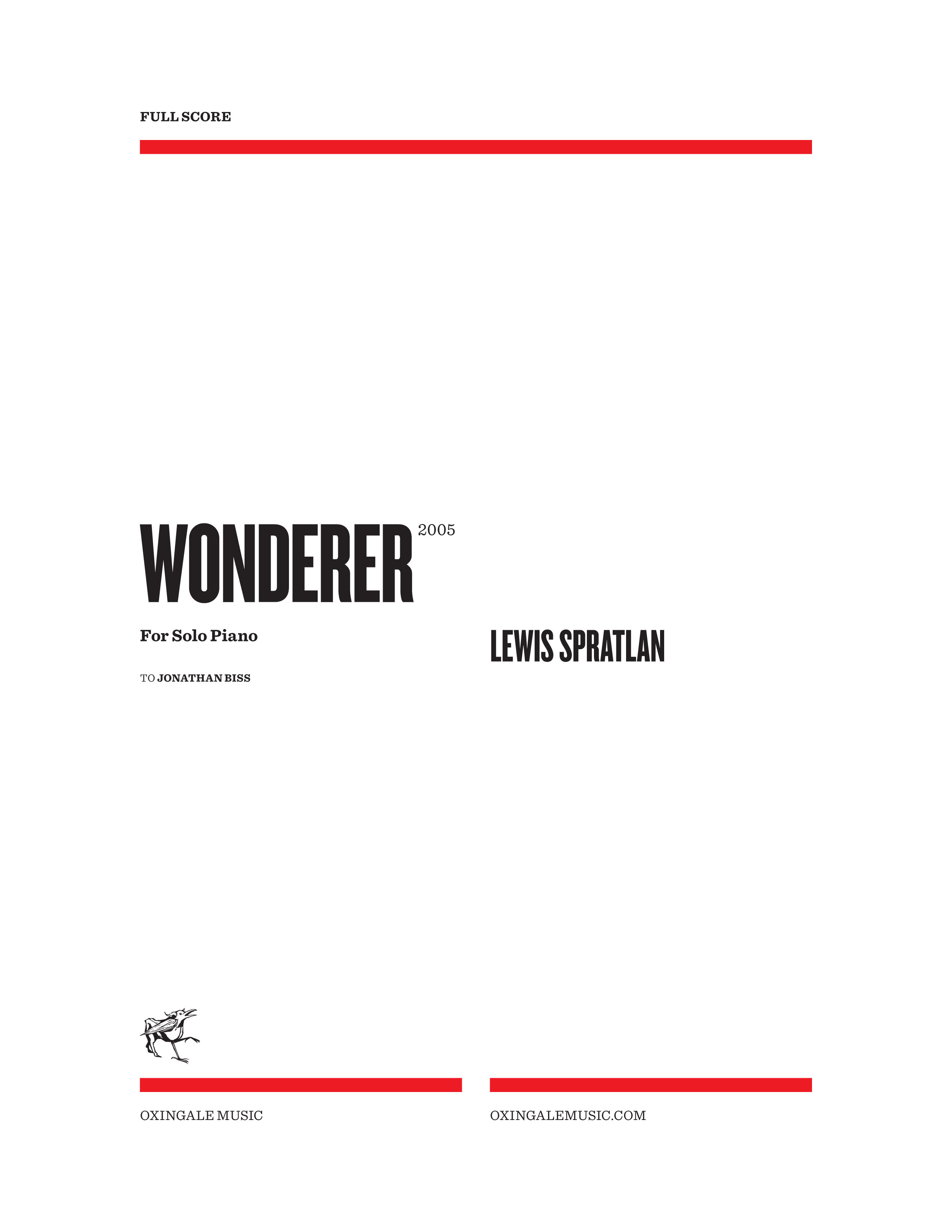 A kind of treble “big bang” spawns elements of this little universe, focusing at last on the footsteps of our Wonderer. These, in multiple guises, mark this quizzical and bemused figure’s presence throughout the piece, as various objects, actions, and feelings are encountered. The music following the big bang offers possibilities for continuing, but each comes up short somehow until a quick perpetuum mobile coheres and prevails. It is interrupted by a country waltz––maybe overheard, maybe remembered––that confronts the real pain beneath stylized car crashes and stolen lovers. The ensuing slow music is inspired by the Andante con moto of Beethoven’s fourth piano concerto, which, by legend, evokes Orpheus calming the raging beasts through song. In the finale a four-bar ostinato takes on three distinct temperaments, the first groping and noncommittal, the second grandiloquent and spectral, the third hyper-generic Latin pop. Each is revealed gradually, like a developing photograph or a jigsaw puzzle. But fragments of musical DNA from earlier in the piece keep us wondering even as the Wonderer’s footsteps reach apotheosis.