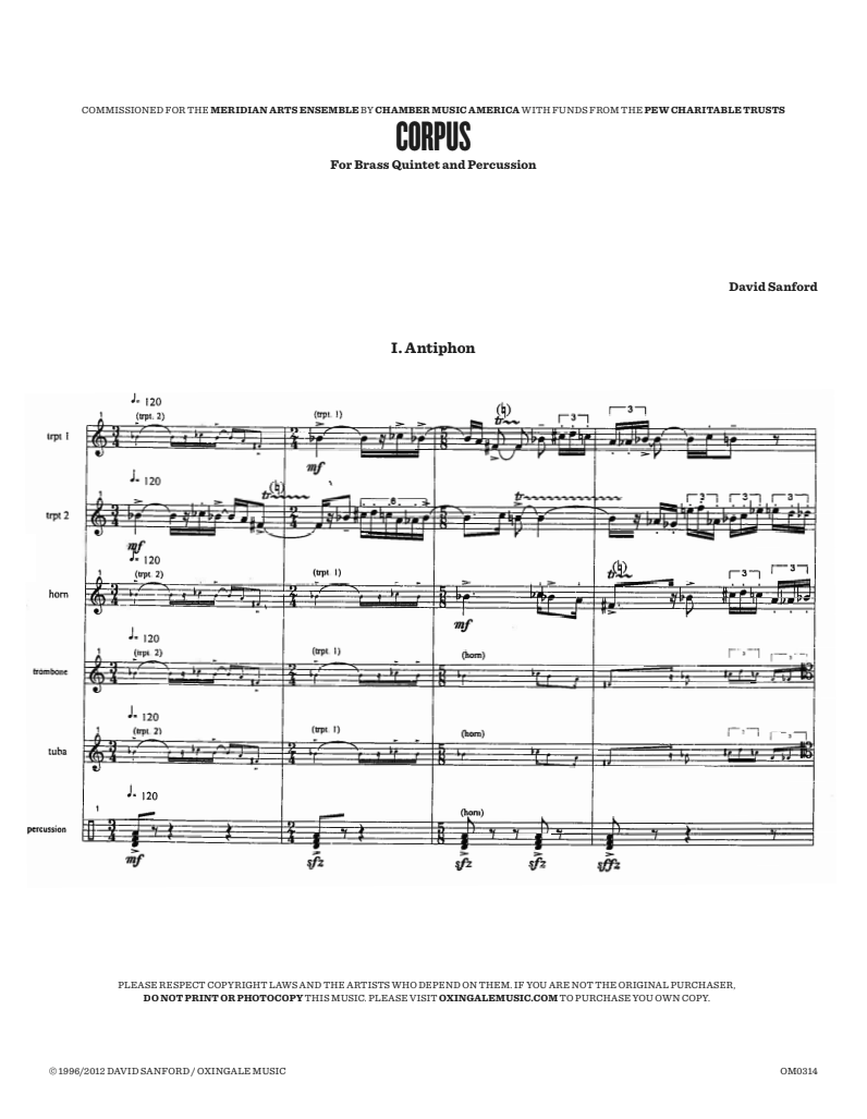 By David Sanford | For Brass Quintet and Percussion | 20′