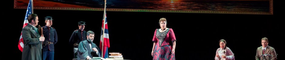 Rexford Tester as Lorrin Thurston, Timothy J. Bruno as Judge Albert Judd, Daryl Freedman as Queen Liliʻuokalani, Ariana Wehr as Kahua, and Hunter Enoch as James Miller – photo by Scott Suchman for WNO