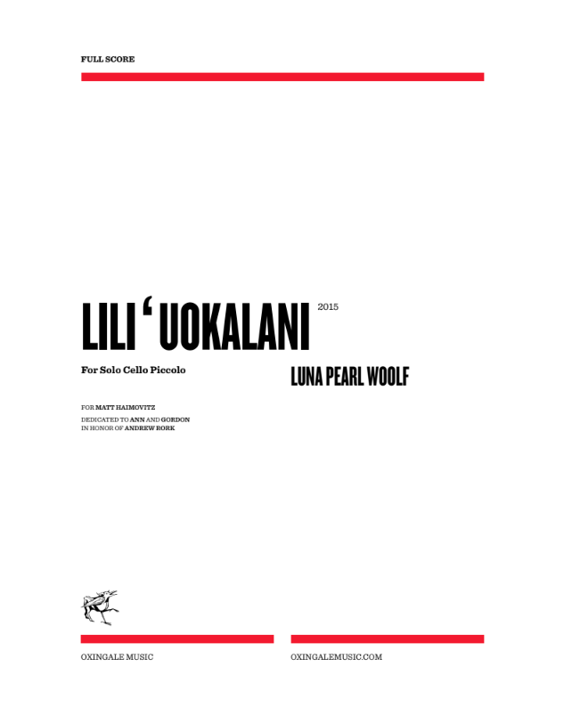 Lili‘uokalani for solo cello piccolo paints a portrait of the queen at this heart-wrenching moment in her reign. Drawn from the cello piccolo’s five strings we hear elements of traditional Hawaiian chant, transformed into ever-expanding harmonies; intimations of pre-Western musical implements and the plucked strings of the queen’s own guitar. We also hear lyrical moments that find their origin in Better Gods, a one-hour opera on the fall of the Hawaiian monarchy, commissioned by the Washington National Opera, which premiered shortly after this work was written. The solo voice of the cello piccolo, itself now all-but-obsolete, develops all these aspects farther than the human voice can go, and offers a glimpse of the strength and inner turmoil of this remarkable woman.