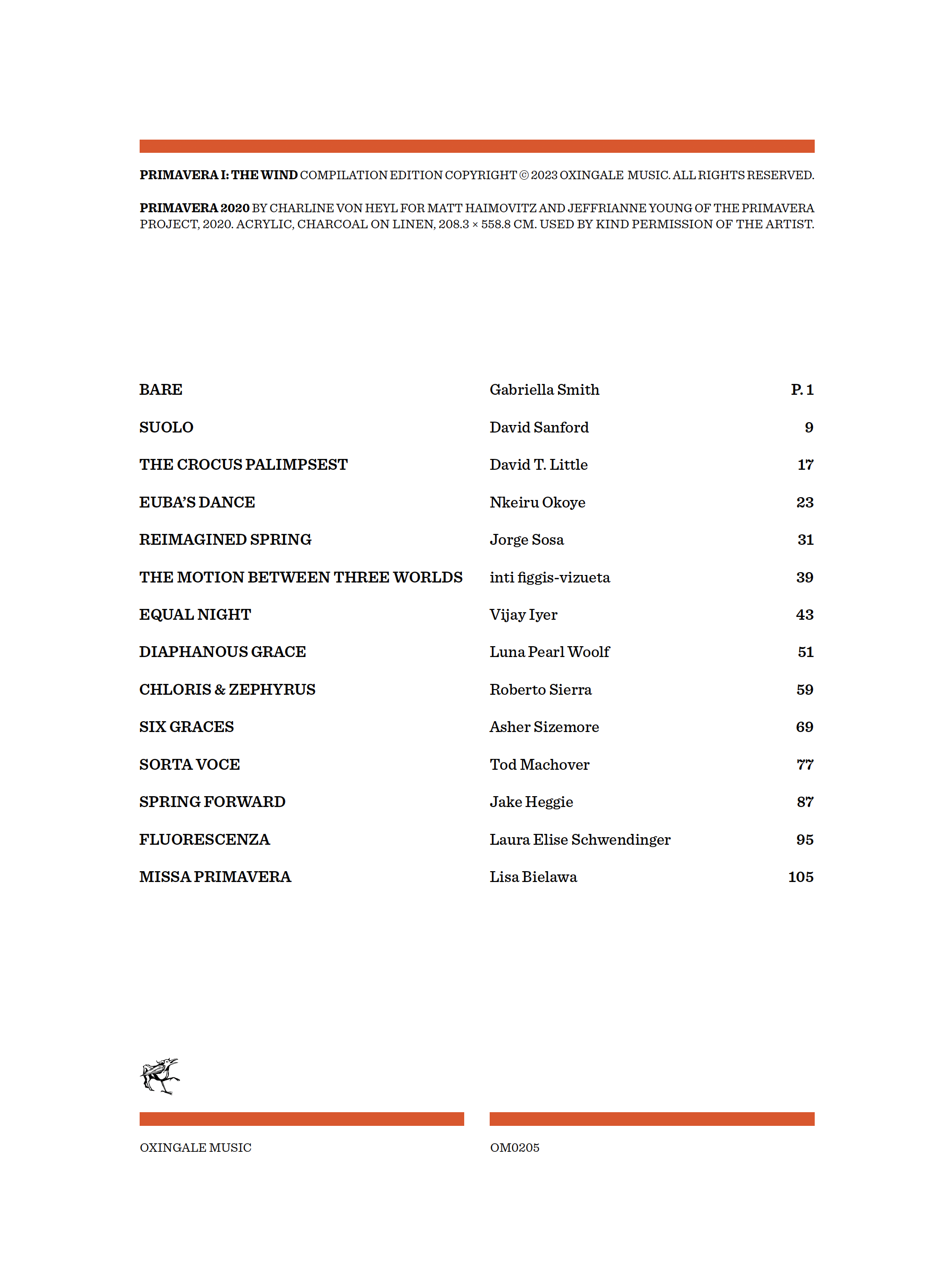My heartfelt thanks to Oxingale Music for all their work making these compilation scores a reality. My deepest gratitude to all of the composers who have joined us on this Primavera journey. The pieces in this first collection arrived, one at a time, in the midst of the darkest days of the pandemic. Each one was a flower that transported me to a musical orchard in another time and place, reminding me anew of the power of music to connect through the centuries.