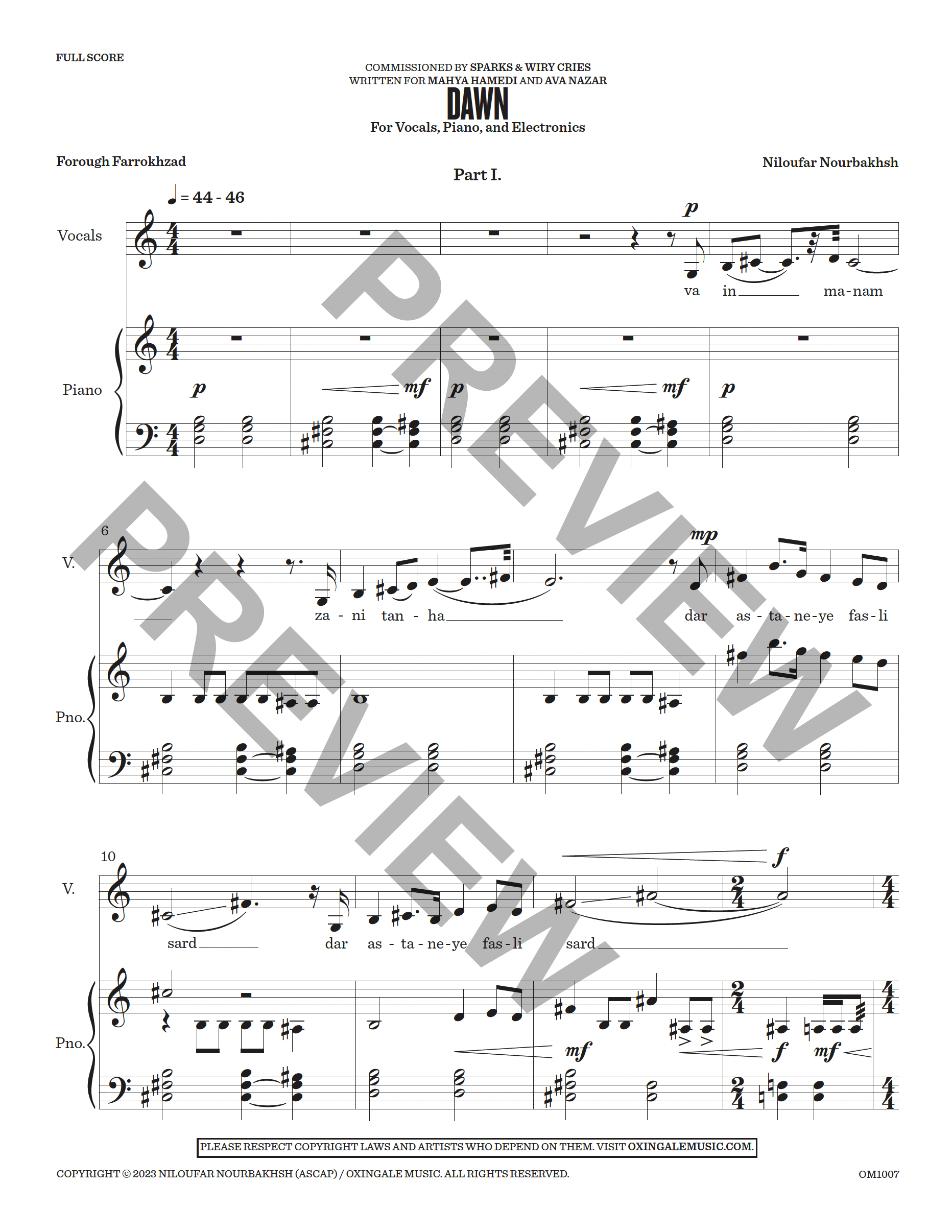 Premiere: First performed January, 20, 2024 during the “Only Voice Remains” program at the National Sawdust in Brooklyn, NY by vocalist Mahya Hamedi and pianist Ava Nazar.