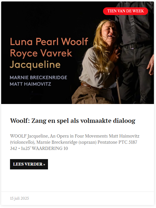 Royce Vavrek’s beautifully crafted libretto effectively switches between emotions, artistic key moments, memories and the ‘why?’ question. In the process, Woolf provides brilliant accompaniment by one fulminant cello. All this in a feverish monologue, in which voice and instrument are turned inside out. No emotion is left untouched, no element of Du Pré’s art is skipped in the cello line. Had she been able to play it herself, she would have done no better than Matt Haimovitz. Soprano Marnie Breckenridge throws herself into the music with supreme focus and a surfeit of voice and expression. But the strength of the performance lies in the balance between spot-on technique and an unerring sense of dramatic rhythm in this tombola of emotions. Never does either go overboard, always the playing and singing are in perfect dialogue. Even better, it also lasts only an hour and twenty-five minutes on two CDs. That keeps it exciting right to the gripping end. So even within conventional music, a brilliant opera could still be composed that adds something to the repertoire. Gorgeously published by Pentatone [Oxingale Series], with a brilliant booklet revealing the plot, clear explanations, the libretto and powerful photos of the performance.