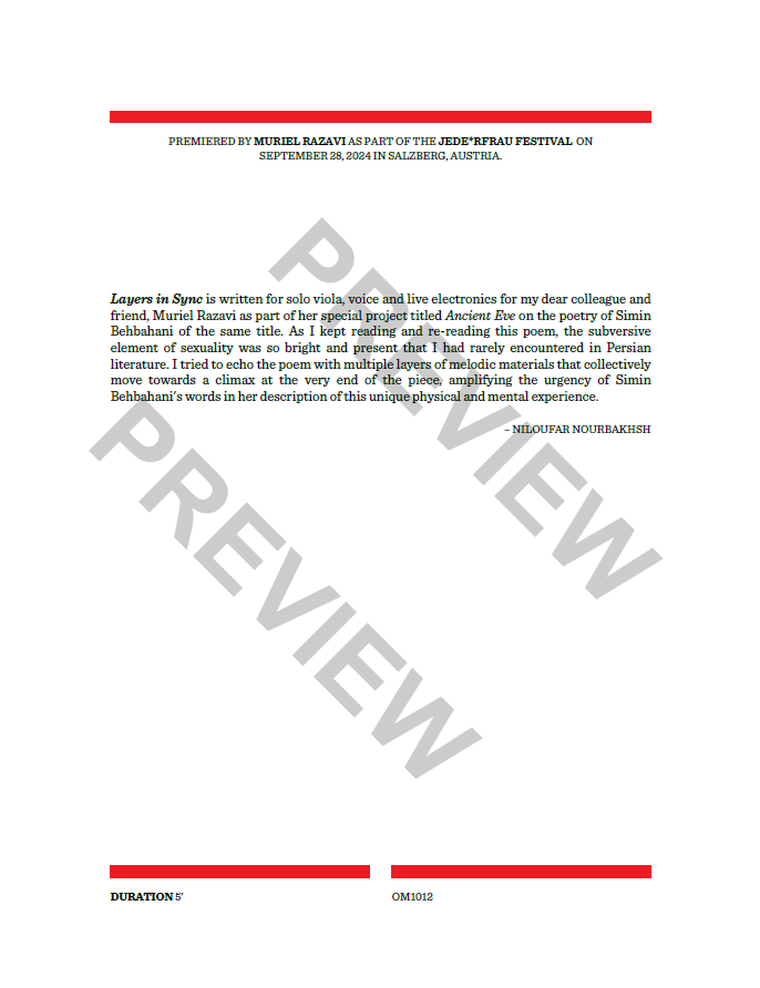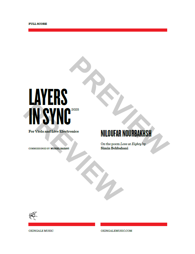 Layers in Sync is written for solo viola, voice and live electronics for my dear colleague and friend, Muriel Razavi as part of her special project titled Ancient Eve on the poetry of Simin Behbahani of the same title. As I kept reading and re-reading this poem, the subversive element of sexuality was so bright and present that I had rarely encountered in Persian literature. I tried to echo the poem with multiple layers of melodic materials that collectively move towards a climax at the very end of the piece, amplifying the urgency of Simin Behbahani’s words in her description of this unique physical and mental experience.